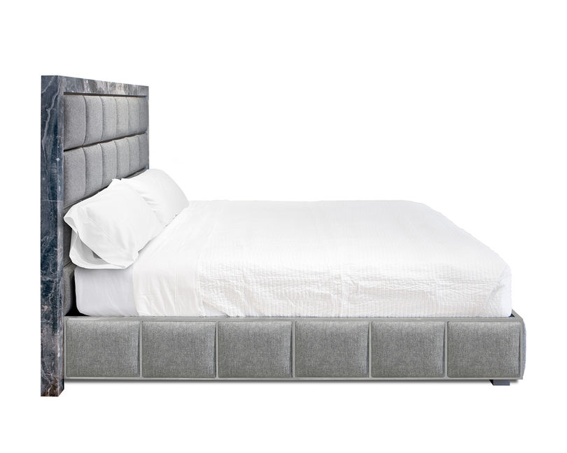 Finishes Shown: Arabescato Marble Frame, Polished Steel Gridwork, Upholstered Grey chenille fabric panels.